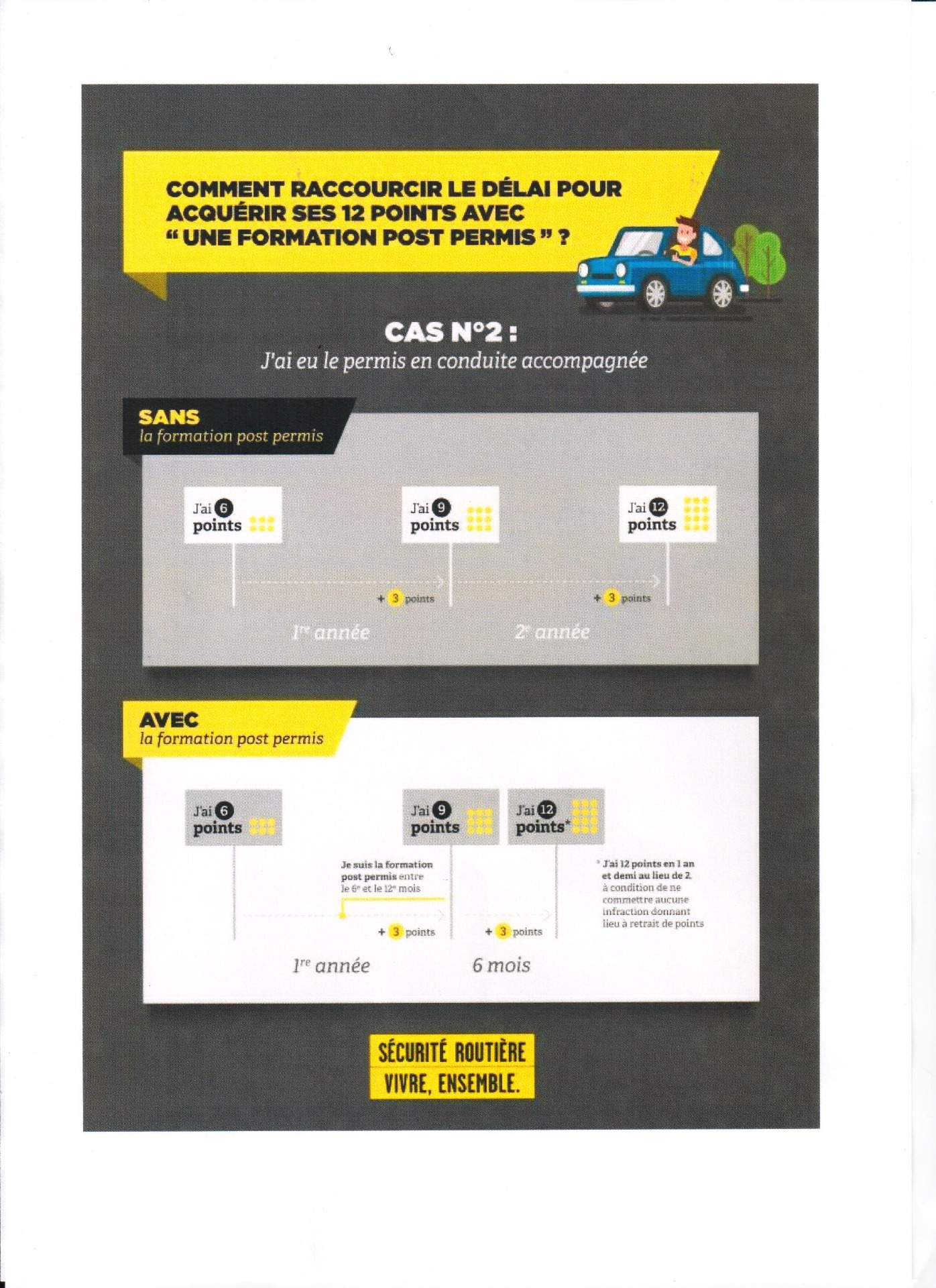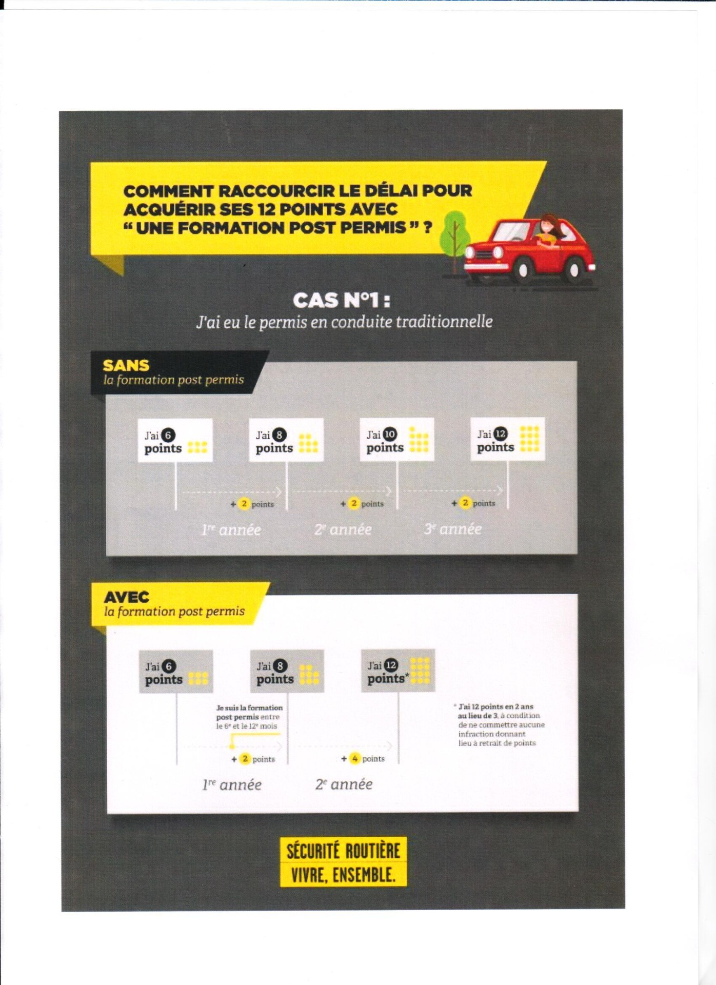 Il est proposé à chaque élève durant son inscription et après l'obtention de son permis, une FORMATION post permis. Cette formation en groupe minimum de 6 personnes d'une durée de 7h00 peut être prise entre 4 à 6 mois après la réussite à l'examen pratique. Elle permet de consolider les acquis, rassurer les jeunes conducteurs et parfois d'apprendre à circuler dans des conditions différentes (par exemple, un élève ayant passé sa formation pendant les mois d'été peut être rassuré de faire une formation en hiver afin d'appréhender les premières neiges de l'hiver) de plus, elle permet d'acquérir une meilleure Perception des risques, se positionner face au risque, se confronter à la perception des autres, et enfin, Prendre en compte les différents points de vue pour mieux appréhender le risque, et prendre des engagements permettant d'affiner la conduite personnelle , mais aussi améliorer notre perception de la route à travers divers modes de déplacement.